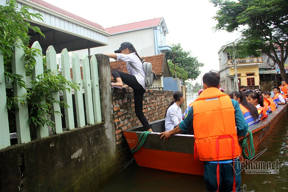 Ngày 2 lượt nhiều em học sinh ở Quốc Oai phải trèo qua nóc nhà cao tầng, vượt tường thậm chí leo cây để tránh lũ đến trường.