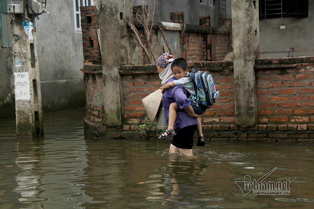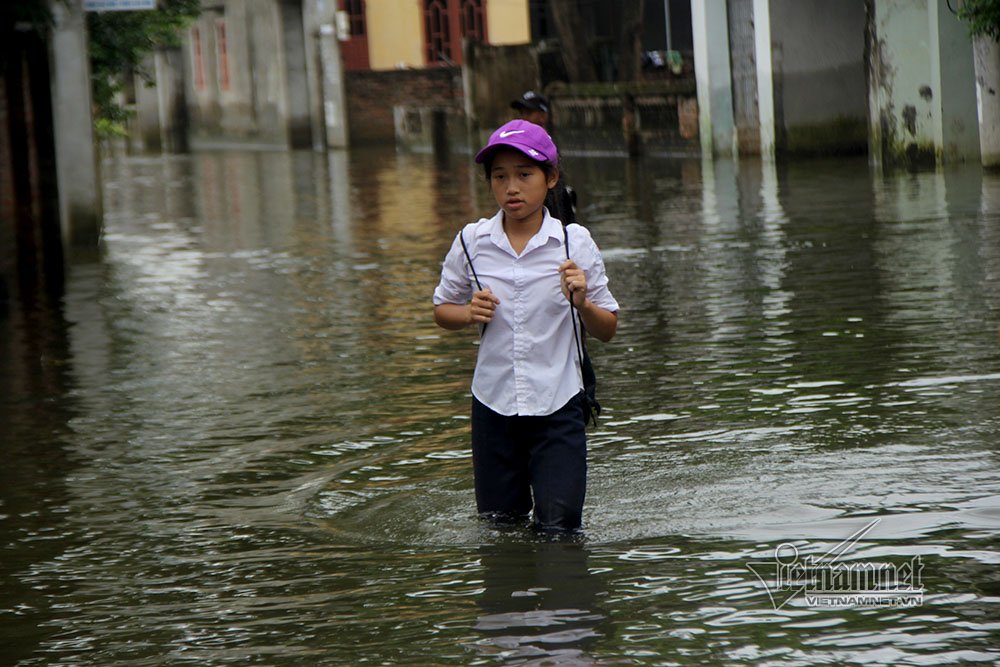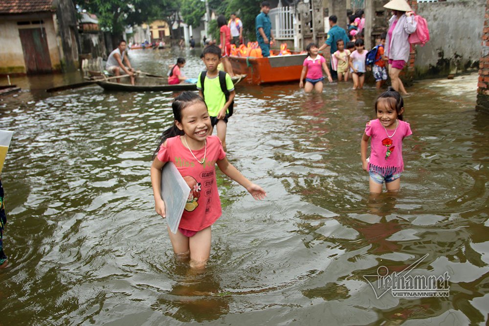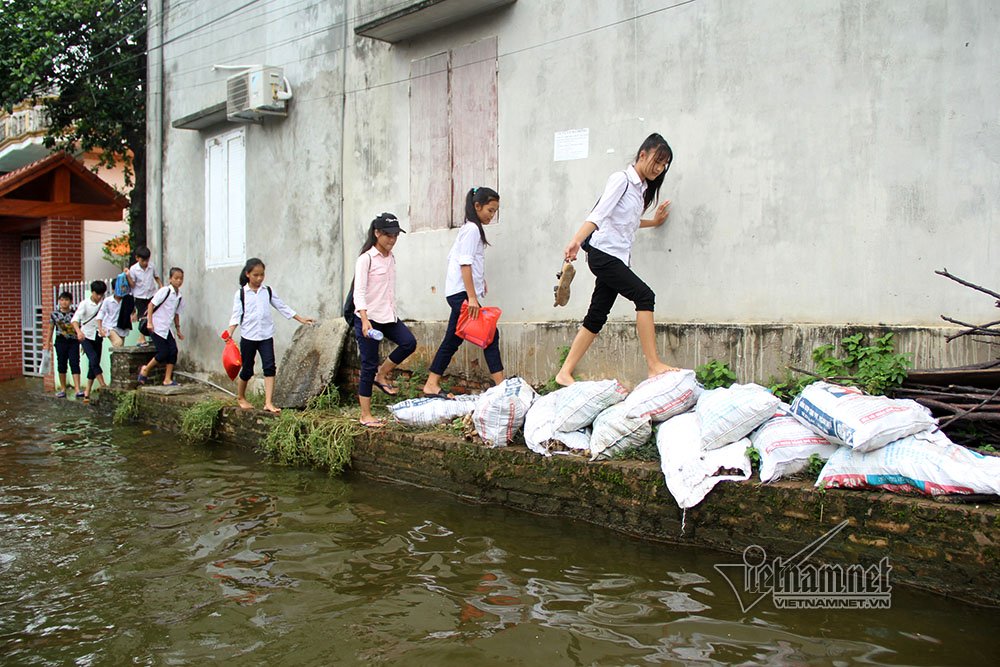 Đường làng ngập sâu, các em men theo bờ tường, bao cát để không ướt quần áo