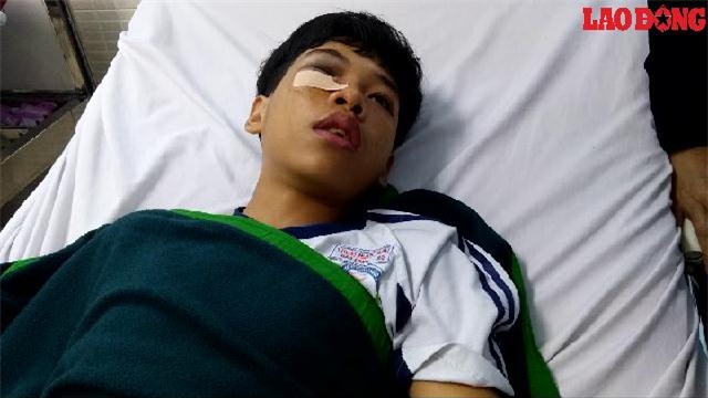 Em Long kể lại câu chuyện bị nhóm bạn cùng trường đánh với vết thương ở mắt.
