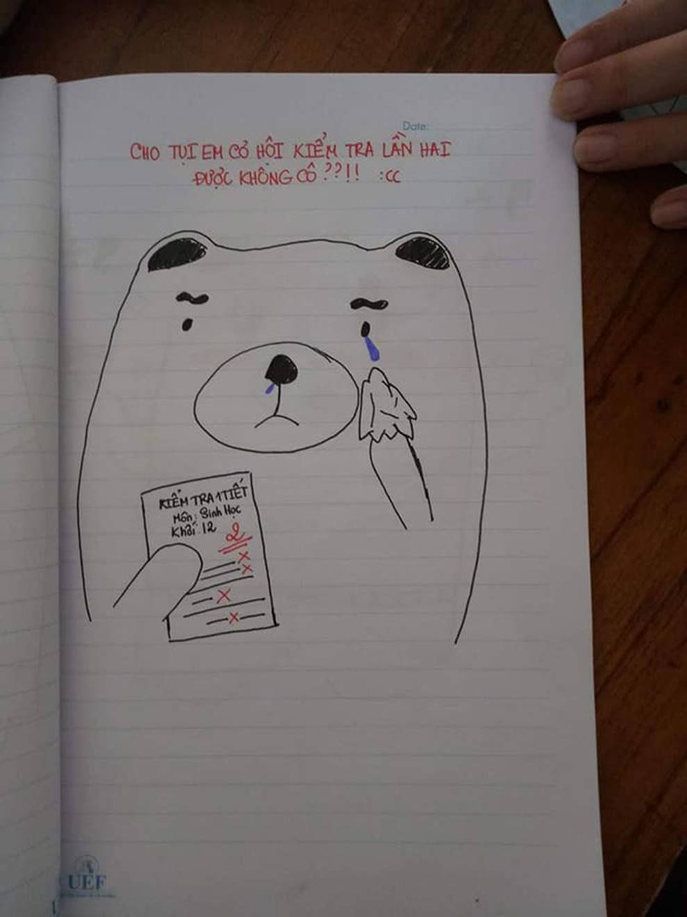Mới đây, cư dân mạng đã được phen xôn xao vì "tâm thư" cực đáng yêu của tập thể lớp 12 Lý - trường Chuyên Nguyễn Bỉnh Khiêm (Vĩnh Long). Bức tâm thư này thực ra là hình ảnh về những chú gấu mập rất cute với nội dung xin phép cô giáo cho thi lại.