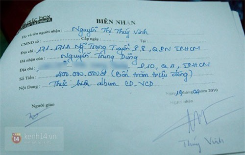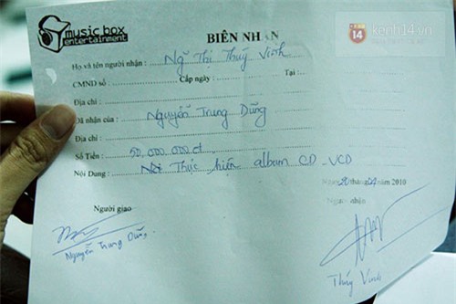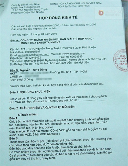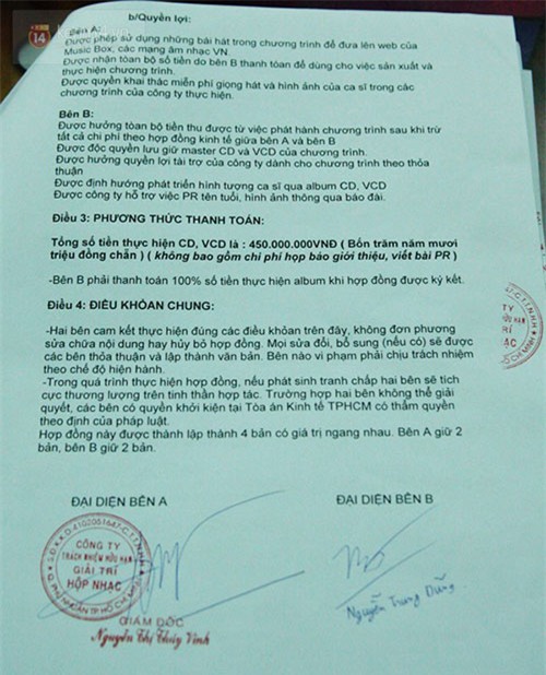 Hợp đồng kinh tế giữa công ty Music Box và Nguyễn Trung Dũng. Số tiền thực hiện album là 450 triệu đồng