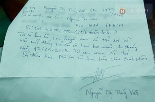 Bà Lan cho biết, vì tin tưởng Thúy Vinh nên lúc đưa tiền, bà không ký kết bất cứ giấy tờ gì, tất cả chỉ là thỏa thuận miệng. Nhưng sau khi nghe tin đồn Thúy Vinh mượn tiền nhiều người nhưng không trả, bà đã đến tận nhà Thúy Vinh vào ngày 9/5 vừa qua, yêu cầu ký giấy cho biết thời gian chính xác trả số tiền 100 triệu đã mượn của gia đình. Bị bà Lan làm áp lực, Thúy Vinh đã viết tay một mẩu giấy xác nhận có mượn tiền của bà Lan nhưng không hẹn ngày trả mà chỉ viết "Tôi hẹn cô Lan 3 ngày sau sẽ trả lời về việc mỗi tháng trả dần cô Lan bao nhiêu. Tôi cam đoan sẽ trả lời đúng hẹn".