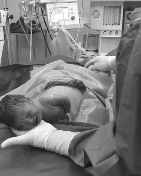 Thỉnh thoảng như cảm thấy hơi thấm mệt vì phải tự chui ra, bé lại “oe oe” khóc vô cùng đáng yêu. Và đặc biệt, vì người mẹ được gây tê chỉ nửa thân dưới nên vẫn có thể quan sát được giây phút con chào đời. Có thể thấy trong đoạn video người mẹ được bác sĩ đỡ cổ lên để có thể ngắm con.