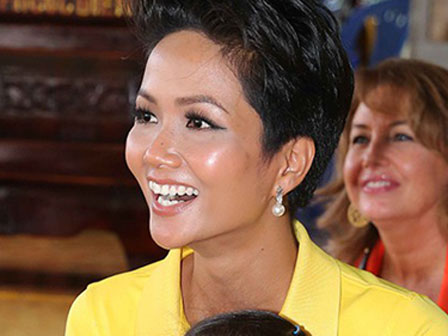 Có làn da nâu nổi bật, H’Hen Niê được trang điểm theo phong cách rất hiện đại với môi màu nude, gương mặt tạo khối sắc sảo. Điểm nhấn được thể hiện ở đôi mắt sâu hút hồn khiến nàng hoa hậu có được vẻ đẹp thông minh, trí tuệ.