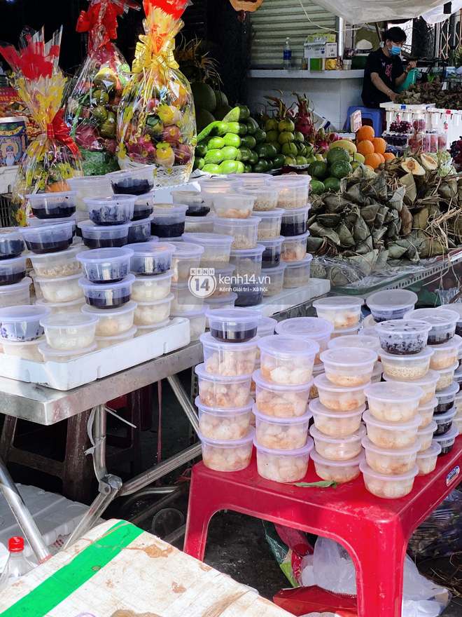 Hầu như nhà nào cũng sẽ dâng cúng tổ tiên các loại món bánh, cơm rượu nếp, chè, xôi… để cầu cho mùa màng bội thu và cuộc sống ấm no. Vậy nên chợ Sài Gòn hôm nay đều có những gian hàng bán chè bán bánh tấp nập người mua. Tuy nhiên, vì ảnh hưởng của COVID-19, nhiều điểm ở Sài Gòn vẫn đang cách ly phong toả nên người dân đi chợ cũng vô cùng cảnh giác, đeo khẩu trang và mua nhanh bán gọn là giải pháp tốt nhất thời điểm này.