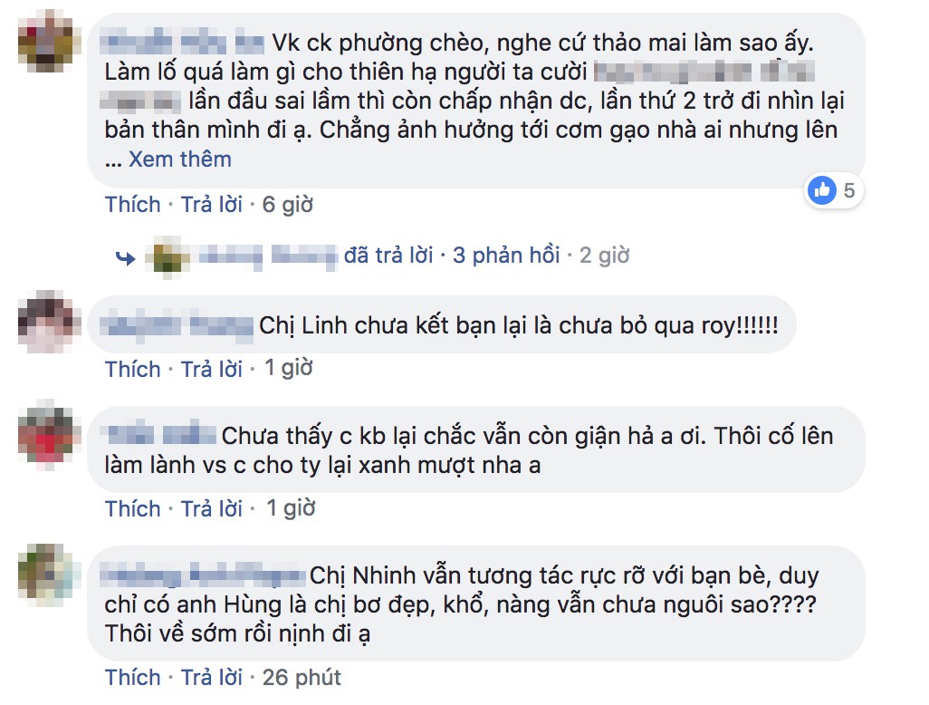 Tuy nhiên, có một điều mà khán giả lăn tăn và cho rằng dù chồng đã xin lỗi nhưng có vẻ Hoàng Linh vẫn chưa nguôi giận khi cô chưa kết bạn Facebook trở lại với ông xã. Ngoài ra, những hình ảnh mới nhất mà Hoàng Linh đăng tải đều được Mạnh Hùng "thả tim". Trong khi đó, Hoàng Linh vẫn trò chuyện rôm rả với bạn bè trên trang cá nhân nhưng tuyệt đối không like ảnh chồng, cũng không để lại bình luận nào dưới status xin lỗi của anh.