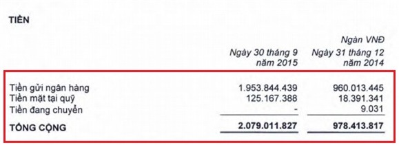 Theo đó, tính đến hết ngày 30/9/2015, tiền của công ty đang ở mức 2.079.011.827 nghìn đồng, cao gấp hơn 2 lần con số 978.413.817 nghìn đồng chốt đến ngày 31/12/2014.