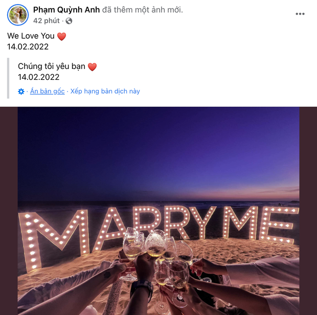 Cách đây không lâu, Phạm Quỳnh Anh cùng loạt sao đình đám trong hội bạn thân "Gia đình văn hóa" như Minh Hằng, Hoàng Thùy Linh, Đông Nhi… đồng loạt đăng tải hình ảnh một buổi tiệc cầu hôn cực lãng mạn trên bãi biển. Được biết buổi tiệc này diễn ra vào Valentine, đáng chú ý là họ đều đính kèm dòng chú thích: "We love you".