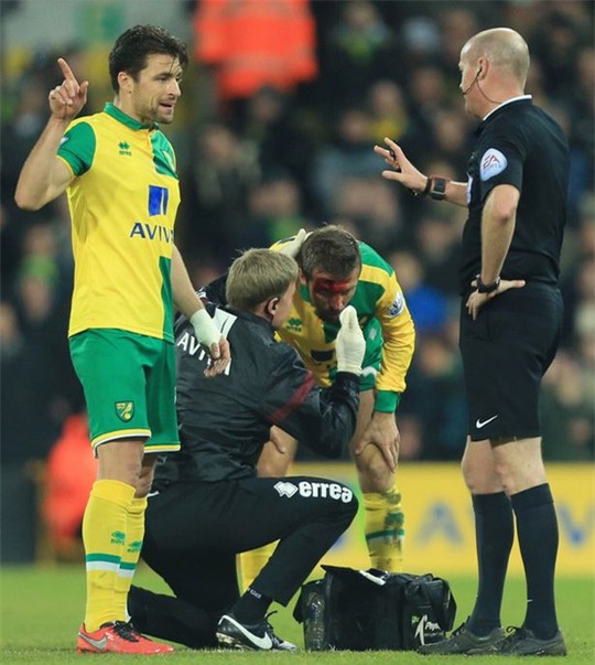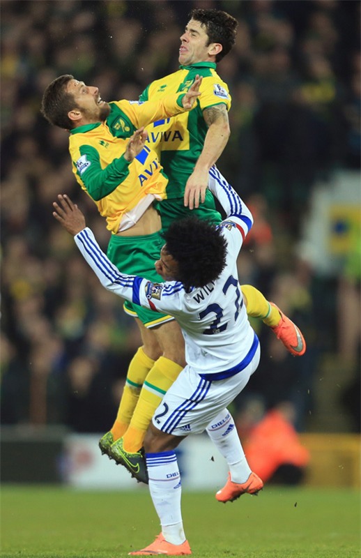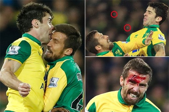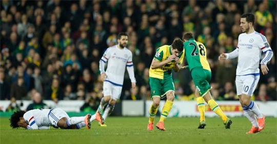 Do "không chiến" quyết liệt với Willian, hai cầu thủ của Norwich đã vô tình va chạm rất mạnh với nhau. Hậu quả là một người bị vỡ đầu còn người kia gãy răng.