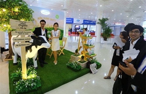 Các phóng viên trong và ngoài nước tham quan gian hàng trưng bày sản phẩm Vinamilk tại Trung tâm báo chí APEC tại Đà Nẵng (Ảnh: Xuân Phú)