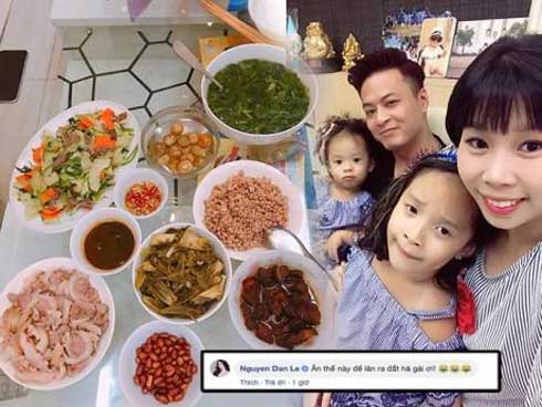 Gần đây, mâm cơm gia đình chỉ có 2 người lớn với 2 cô con gái nhỏ nhưng lại có tới 8 món, trong đó là 4 đĩa thịt đầy ắp của gia đình Hồng Đăng được bà xã Anh Đào đăng tải trên mạng xã hội đã thu hút sự chú ý của nhiều người.