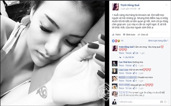 “1 buổi sáng mà hàng tá missed call. Tôi biết mọi người sẽ hỏi những gì. Nhưng thời điểm này tôi không muốn trả lời bất cứ liên quan gì hết. Anh chị phóng viên thông cảm giúp tôi. Lúc này tôi cần được nghỉ ngơi. Tôi sẽ trả lời thắc mắc của mọi người sớm thôi...”-Hồng Quếviết.