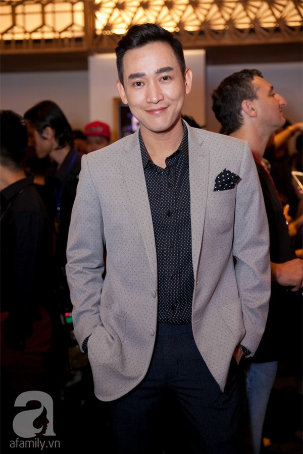 Huỳnh Anh lịch lãm trong bộ vest đen sóng đôi cùng bạn gái Hoàng Oanh.