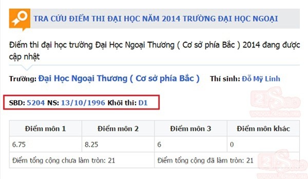 Thông tin ngày sinh 13/10/1996 và khối thi D1 của hoa hậu Đỗ Mỹ Linh là hoàn toàn chính xác. Theo đó, tổng điểm 3 môn Toán, Tiếng Anh và Ngữ Văn của Mỹ Linh là 21. Số điểm 21 khá cao, song chưa được xem là ấn tượng đối với thí sinh thi đầu vào tại Đại học Ngoại thương.