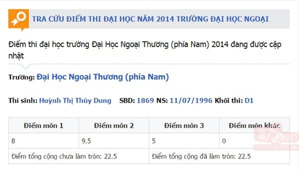 Theo thông tin tra cứu được, Thùy Dung thi đỗ vào ĐH Ngoại thương TP. HCM khối D1, với số điểm 22.5, cao hơn so với hoa hậu Mỹ Linh. Đặc biệt, điểm thi môn Tiếng Anh của Thùy Dung đạt điểm số gần như tuyệt đối, không thể ấn tượng hơn 9.5.