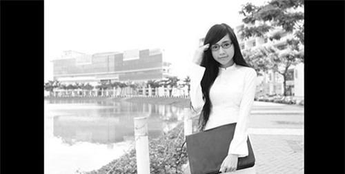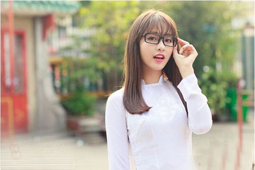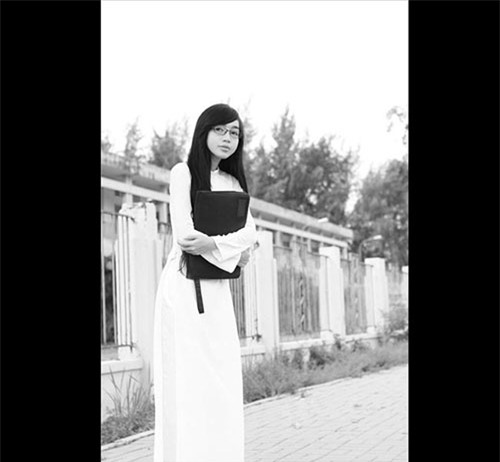 Mái tóc được kẹp điệu đà, khuôn mặt trang điểm nhẹ nhàng, diện áo dài trắng, ôm cặp sách đen, hot girl xứ Nghệ được ví trẻ như nữ sinh 18. |