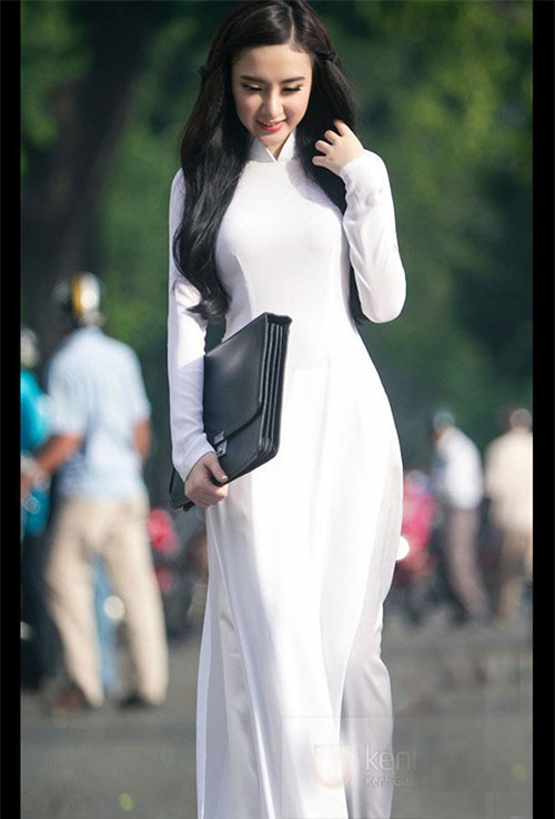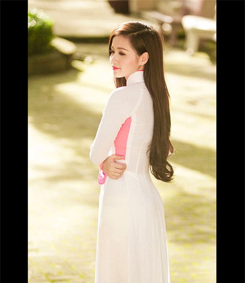 Thế nhưng, khi diện áo dài trắng, hot girl Sài thành vẫn "khoe khéo" được vẻ đẹp thướt tha, uyển chuyển với ba vòng chuẩn. |
