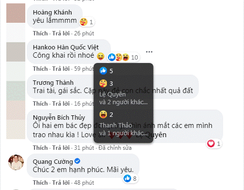 Dưới phần bình luận, đông đảo đồng nghiệp, bạn bè và người hâm mộ gửi lời chúc mừng hạnh phúc tới Lệ Quyên. Nữ ca sĩ vui vẻ đón nhận sự yêu thương từ mọi người, thả những icon ngọt ngào thay cho lời cảm ơn.