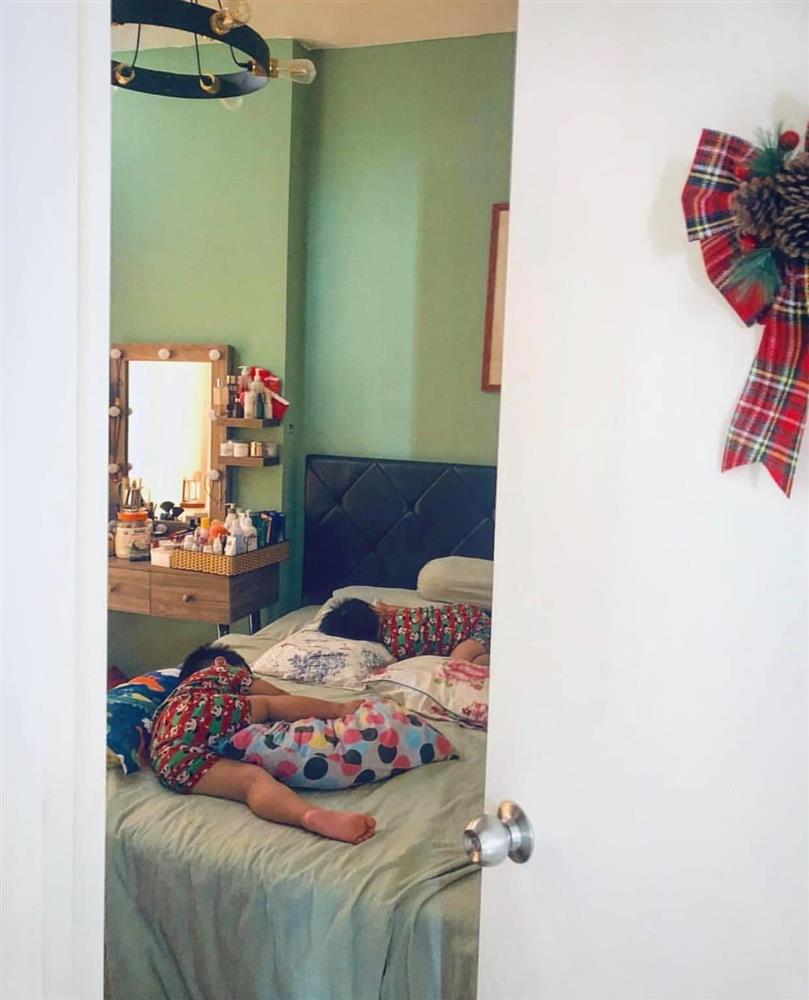 "Hồi đầu sinh non, cả nhà ai cũng o bế cưng như trứng thành ra Ben và Liam toàn được bế ru ngủ. Khi 2 bé được khoảng 10 tháng, một hôm 3 mẹ con đang nằm kể chuyện rù rì, mở đèn vàng nhẹ 1 hồi thì 2 ẻm ngủ lúc nào không biết, chẳng cần bế ru nữa. Từ lúc đó là mình cứ nằm kể chuyện, tắt đèn mở đèn ngủ máy lạnh 26-27 độ là tự ngủ ngon ơ. Lớn lên như bây giờ thì cứ 8h30 tối 2 bé tự xách gối leo lên giường, goodnight bố mẹ rồi ngủ khò".