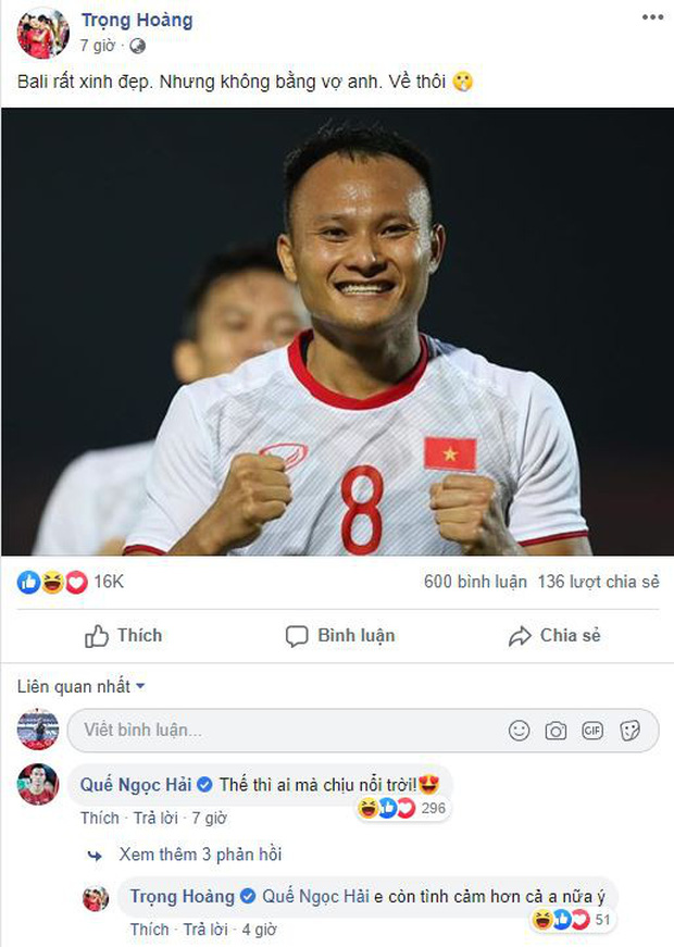 Sáng 16/10, tuyển Việt Nam lên đường rời Bali, Indonesia trở về Việt Nam. Sau chiến thắng 3-1 trước đội chủ nhà, các cầu thủ đều mang tâm trạng thoải mái, vui vẻ. Các chàng trai thi nhau cập nhật những hình ảnh về chuyến đi Bali thi đấu lên mạng xã hội. Tuy nhiên, mọi sự nhắng nhít, hài hước đều bị lu mờ bởi bài đăng của hậu vệ Nguyễn Trọng Hoàng. Trên Facebook cá nhân, Trọng Hoàng đăng bức ảnh anh chàng trong trận đấu giữa tuyển Việt Nam và tuyển Indonesia với lời chia sẻ ngắn gọn mà ngọt như đường gửi tới bà xã xinh đẹp tại quê nhà: "Bali rất xinh đẹp. Nhưng không bằng vợ anh. Về thôi".
