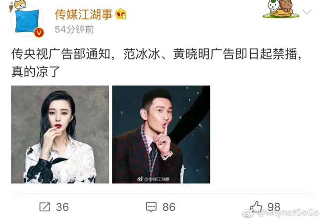Mới đây, một blogger đã đăng tải thông tin cho hay phía Tổng cục Phát thanh điện ảnh truyền hình Trung Quốc (SARFT) chuẩn bị ra thông báo cấm tất cả quảng cáo do Phạm Băng Băng và Huỳnh Hiểu Minh làm đại diện phát trên truyền hình.
