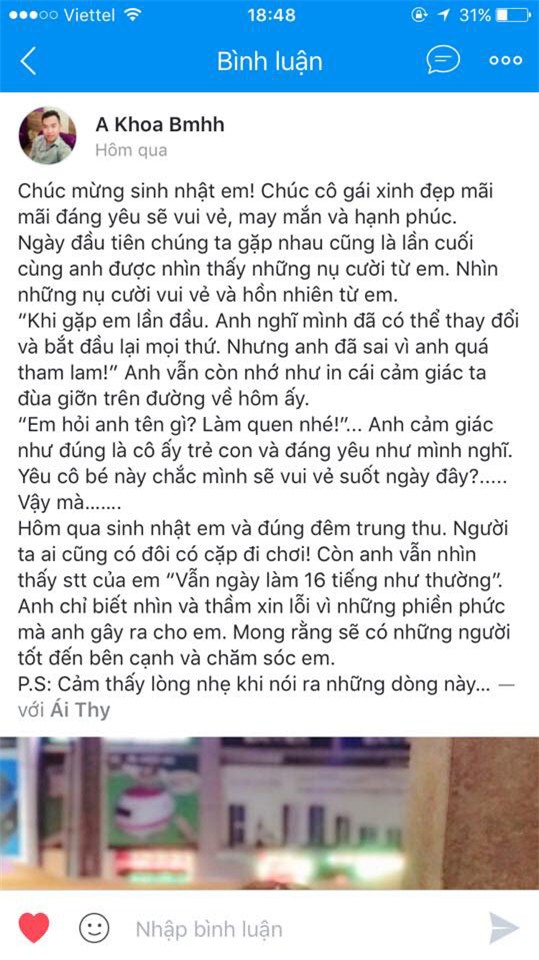 Trên trang cá nhân của mình mới đây, Anh Khoa đã đăng ảnh chụp Ái Thi và dành những lời ngọt ngào để chúc mừng sinh nhật cô. Chàng trưởng phòng kinh doanh đồng thời cũng bày tỏ "Anh còn nhớ như in cái cảm giác ta đùa giỡn trên đường về hôm ấy. Anh chỉ biết nhìn và thầm xin lỗi vì những phiền phức mà anh gây ra cho em. Mong rằng sẽ có người tốt đến bên cạnh chăm sóc em."