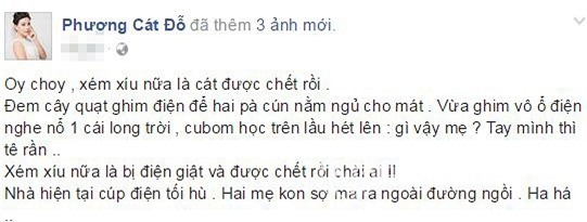 Cát Phượng chia sẻ: "Đem cây quạt ghim điện để hai bà cún nằm ngủ cho mát . Vừa ghim vô ổ điện nghe nổ 1 cái long trời , cu Bom học trên lầu hét lên : gì vậy mẹ ? Tay mình thì tê rần .. Xém xíu nữa là bị điện giật. Nhà hiện tại cúp điện tối om . Hai mẹ con sợ ma ra ngoài đường ngồi.". Sau khi Cát Phượng chia sẻ bị điện giật nhiều fan đã khuyên cô nên cẩn thận hơn và kiểm tra lại toàn bộ nguồn điện trong nhà.