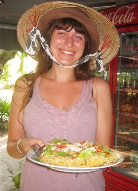 Một nữ du khách Mỹ thích thú với món hủ tiếu chiên giòn.