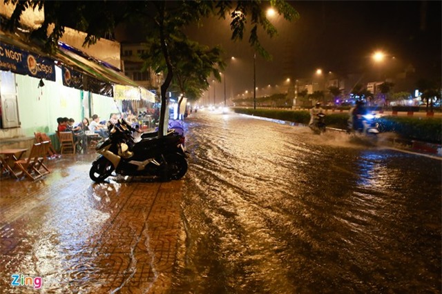 Cơn mưa lớn trút xuống lúc 20h và kéo dài đến hơn 22h đêm 22/10 đã khiến nhiều tuyến đường ở TP HCM ngập sâu. Tại đại lộ Phạm Văn Đồng, nước tràn vào các quán ăn bên đường. |
