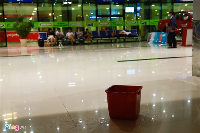 Khu vực cửa ga đến quốc nội bị dột nhiều nơi. Hàng chục xô chậu được nhân viên sân bay mang ra xếp hứng nước mưa. |