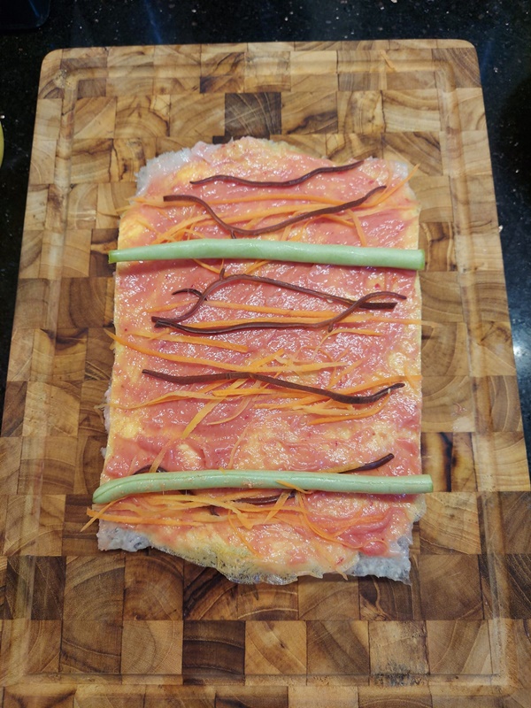 - Bóng bì mang cắt làm 2 phần, dùng thìa lấy 1/3 giò sống phết 1 lớp lên miếng bóng, đặt trứng tráng mỏng lên, thêm 1 lớp mọc đỏ son. Cho đậu que, mộc nhĩ, cà rốt lên trên rồi cuộn chặt miếng bóng lại. Dùng chỉ buộc chặt lại. Làm tương tự với miếng bóng còn lại.