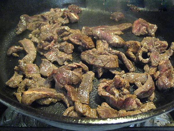 Bước 2: Cho thịt bò đã được ướp sẵn vào xào sơ. Cho đến khi thịt săn lại rồi trút ra đĩa. Giữ lại phần nước xào thịt bò trong chảo.