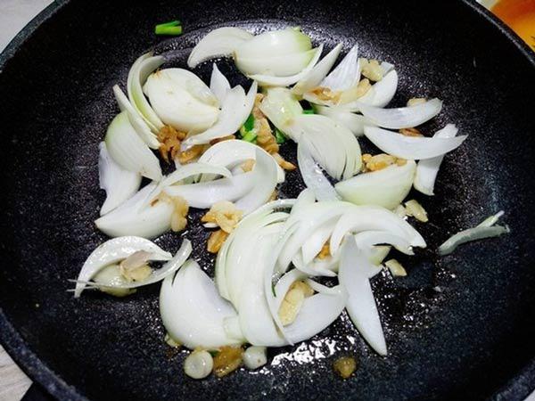 Bước 3: Tiếp tục cho hành tây vào chảo trước đó tiếp tục xào chín. Đảo đều tay, cho đến khi hành tây hơi se lại thì cho thịt bò xào sơ vào tiếp tục xào.