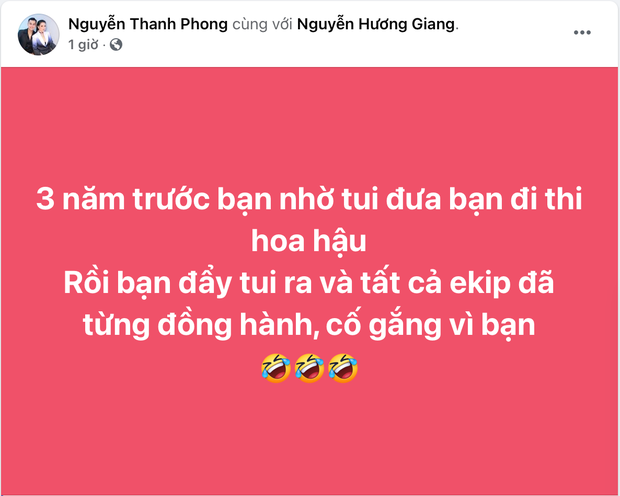 Vào trưa ngày 18/1, cựu quản lý của Hương Giang - Nguyễn Thanh Phong bất ngờ đăng status đấu tố nàng Hậu: "3 năm trước bạn nhờ tui đưa bạn đi thi Hoa hậu. Rồi bạn đẩy tui ra và tất cả ekip đã từng đồng hành, cố gắng vì bạn". Sau vài phút, anh tag thẳng Hương Giang vào dòng trạng thái, đồng thời tiết lộ thêm nhiều câu chuyện bên dưới phần bình luận.