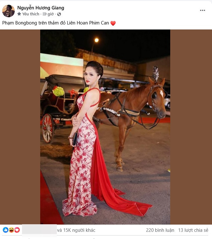 Cô hài hước ví mình phiên bản fake của Phạm Băng Băng dự thảm đỏ liên hoan phim Cannes. Tuy nhiên, thực chất đây là hình ảnh Hương Giang dự sự kiện Mai Vàng cách đây 11 năm.