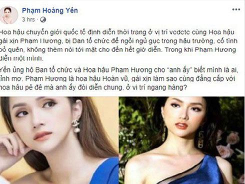 Chưa hết, NTK này còn bổ sung: "Các bạn được trả cát-sê cao hơn những người mẫu bình thường (Hà Duy trả cát-sê cho Hương Giang rất cao), được để ở những vị trí đẹp, được ưu tiên đi tập muộn vì lịch trình công việc cá nhân, được mọi người chú ý nhiều hơn trên sân khấu thì trách nhiệm, ý thức và công việc của các bạn phải bỏ ra nhiều hơn, xứng đáng với tình cảm, sự ưu ái của các nhà thiết kế và sự yêu mến của khán giả".