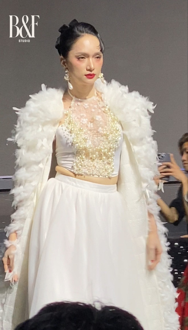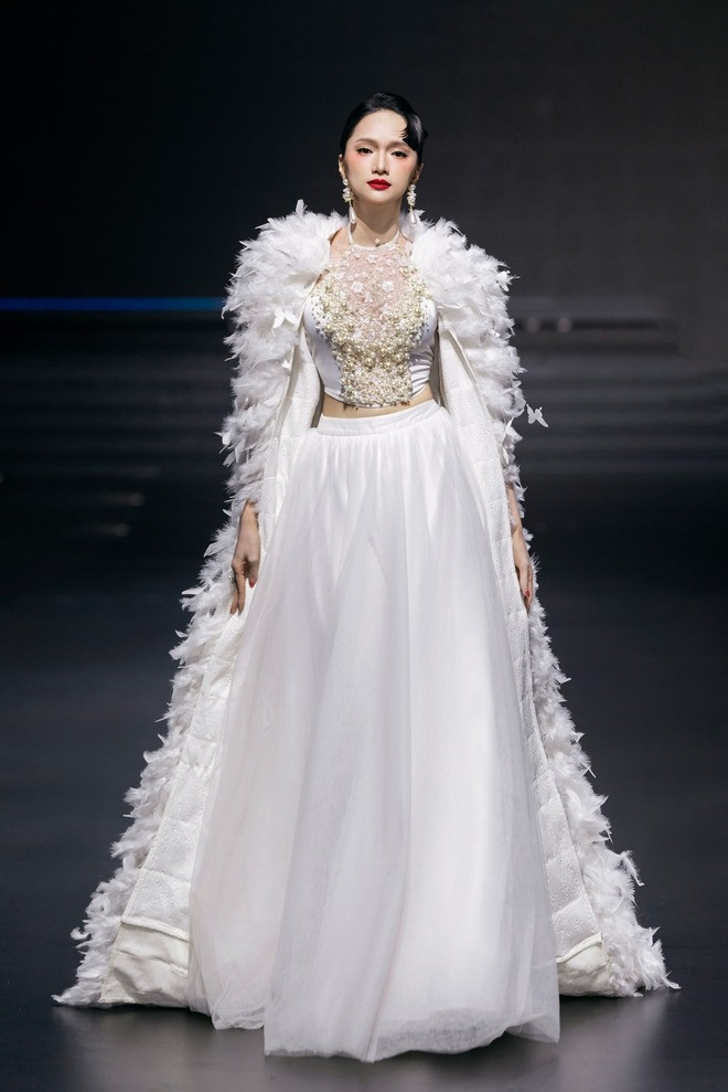 Hoa hậu Hương Giang là gương mặt được "chọn mặt gửi vàng" vào vị trí vedette trong show của NTK Cao Minh Tiến. Xuất hiện trên sàn diễn, người đẹp diện bộ trang phục màu trắng.