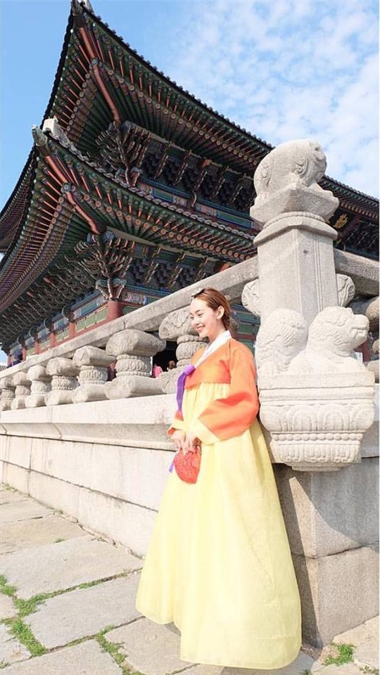 Ca sĩ Minh Hằng diện hanbok truyền thống trong chuyến du lịch Hàn Quốc.