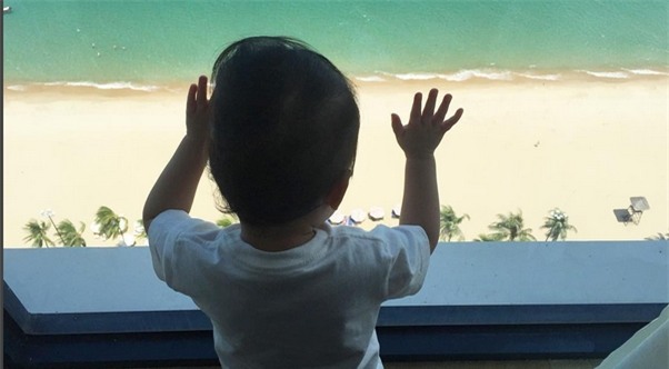 "Ngọc nữ" cũng khoe khoảnh khắc ngắm biển cực dễ thương của con trai qua khung cửa kính.