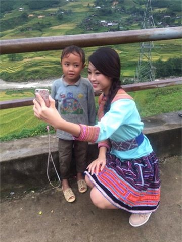 Hoa hậu Mỹ Linh thích thú chụp ảnh cùng trẻ em vùng cao.
