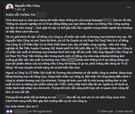 Mới đây, thông tin về Công ty Cổ phần Sản xuất và Thương mại eHerbal được thành lập năm 2017, có 6 lao động chính thức đang nhận về sự quan tâm lớn. Bởi loạt sản phẩm Detox liên quan đến doanh nghiệp nói trên được vợ chồng Hữu Công quảng bá rầm rộ trên mạng xã hội suốt thời gian qua.
