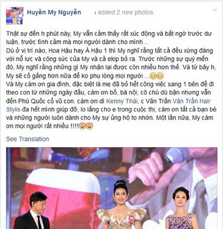 Bên cạnh đó, Huyền My không quên gửi lời cám ơn đến người thân đã động viên và giúp đỡ mình.