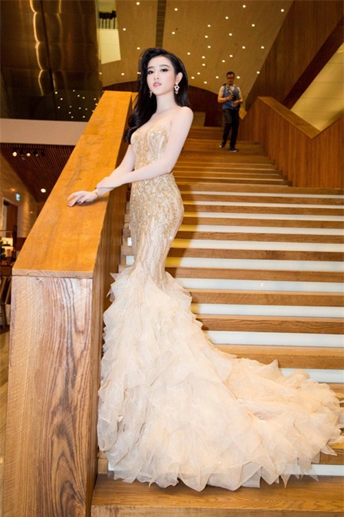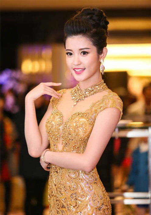 Tại sự kiện đầu tiên tham dự sau khi giành ngôi Á hậu 1 cuộc thi Hoa hậu Việt Nam, Huyền My mặc bộ váy màu vàng đồng, xuyên thấu. Cô búi tóc cao sang trọng, đeo phụ kiện ton-sur-ton
