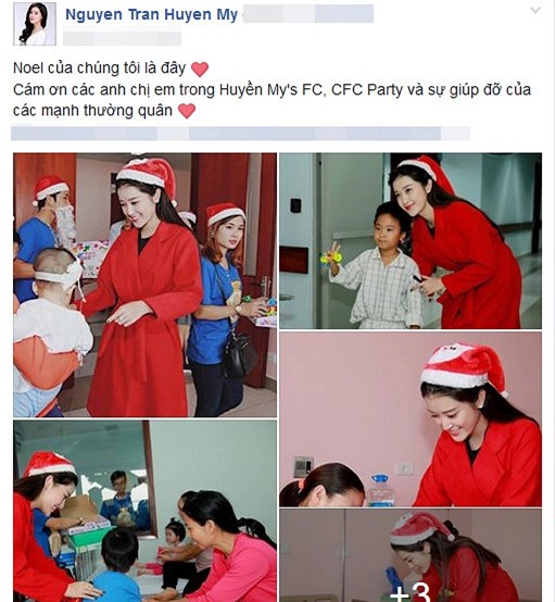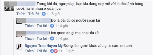 Mọi sự chú ý lúc này đều đổi hướng và đổ dồn vào Huyền My, mong chờ được nghe phản hồi từ cô. Và cách đây ít phút, khi Á hậu đăng tải loạt ảnh đi từ thiện kèm theo chú thích: "Noel của chúng tôi là đây. Cám ơn các anh chị em trong Huyền My's FC, CFC Party và sự giúp đỡ của các mạnh thường quân" thì bên dưới, một người đã bình luận như sau: "Trong khi đó, ngược lại, bạn kia đang say mê với thuốc lá và bóng cười, hú hí nhau ở quán bar". Ngay lập tức, Huyền My đáp trả: "Đừng lôi người khác vào ạ, em cám ơn anh". Có thể thấy, với những lời cáo buộc gián tiếp vừa qua, dù chưa chính thức lên tiếng nhưng Huyền My đã có động thái là không liên quan đến sự việc này.