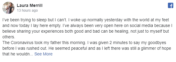 "Mọi người đang chết dần. Bạn nghĩ điều đó sẽ không xảy ra với bạn hoặc gia đình khỏe mạnh của bạn. Nó có đó. Hãy ở nhà không phải vì bạn cũng vì người khác. Đối với cha tôi. Điều này là có thật. Có lẽ chúng tôi sẽ không thể bày tỏ sự tiếc thương ông theo đúng nghi lễ của một đám tang. Tôi vừa đánh mất tình yêu lớn nhất của đời mình và sẽ không thể ôm ai vì bản thân cũng cần phải tự cách ly trong hai tuần... một mình", cô nói.