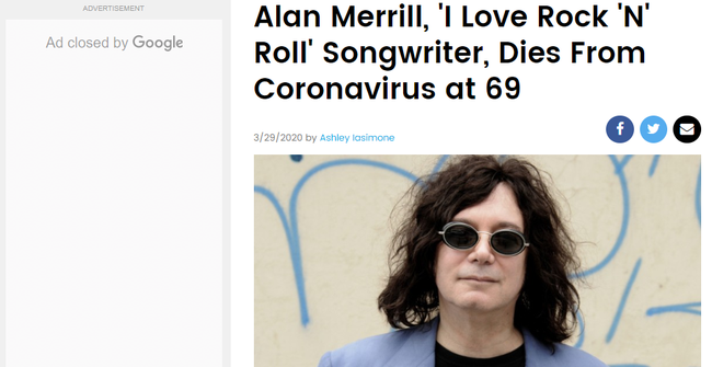 Giới truyền thông Mỹ mới đây đưa tin, ca sĩ rock chủ nhân ca khúc "I Love Rock 'N' Roll" Alan Merrill, đã qua đời ở tuổi 69 sau khi được xét nghiệm dương tính với Covid-19. Thông tin này được cung cấp bởi Laura Merrill - con gái của ông. "Virus Corona đã đưa cha tôi đi vào sáng nay 29/3", con gái Alan Merrill chia sẻ trên trang cá nhân.
