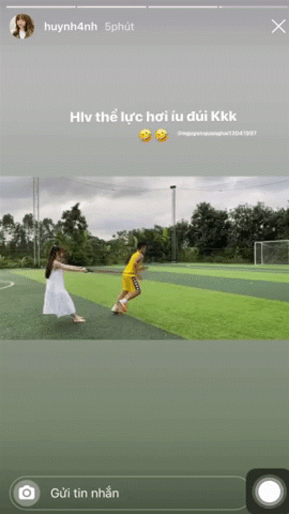 Huỳnh Anh ở bên cạnh liên tục cổ vũ bạn trai cố lên giống như một PT "chuyên nghiệp" (PT (Personal Trainer) là Huấn luyện viên thể hình cá nhân). Cô nàng có lúc còn hóa thân thành "HLV thể lực" hỗ trợ Quang Hải. Ở bài tập này, Quang Hải dùng một sợi dây chun khá dài đặt ngang bụng và chạy về phía trước. Nhiệm vụ của Huỳnh Anh là cầm 2 đầu dây kéo về phía sau để tạo lực cản bước chạy của Quang Hải.