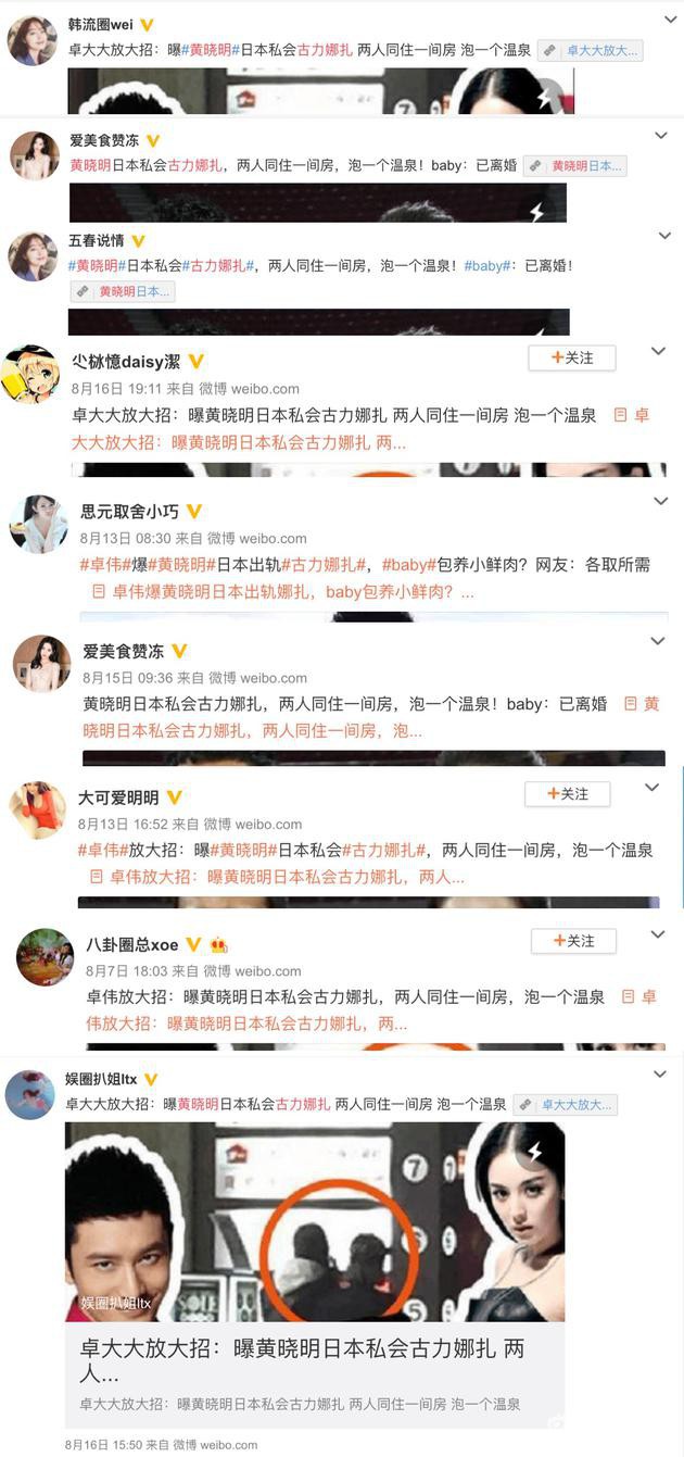 Trang Sina đưa tin, 1 tài khoản tự nhận là Trác Vỹ trên mạng xã hội bất ngờ tung hình ảnh và thông tin cho biết, Huỳnh Hiểu Minh và Cổ Lực Na Trát bí mật sang Nhật Bản du lịch, cùng thuê 1 phòng khách sạn tại đây. Nhiều blogger khác đã chia sẻ lại thông tin này và gây hoang mang dư luận.