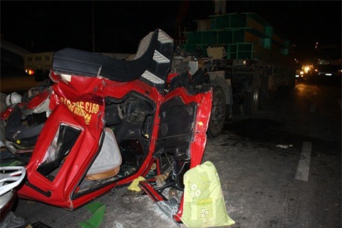 Số dầm thép đè lên vị trí phụ xe ngồi, phải chờ xe cẩu đến nâng dầm thép ra ngoài, phụ xe mới được giải cứu. Rất may, phụ xe chỉ bị thương nặng đã được tài xế đưa đến bệnh viện.