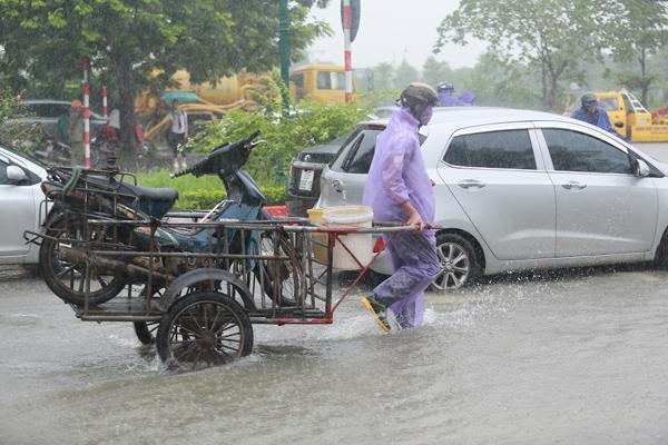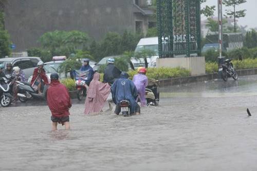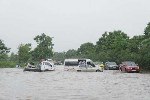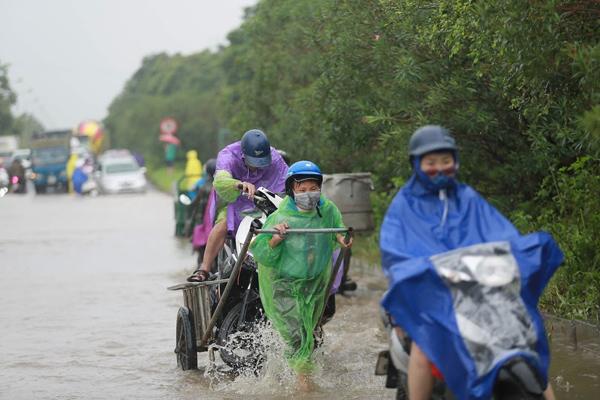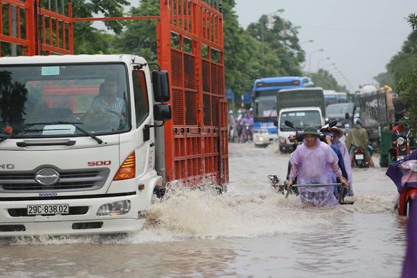 Đường Đại lộ Thăng Long, Thiên đường Bảo Sơn khu vực phía tây thành phố... cũng bị ngập nặng gần 80cm. Nước ngập sâu khiến các phương tiện không thể di chuyển, ô tô, xe máy chết máy la liệt trên đường.